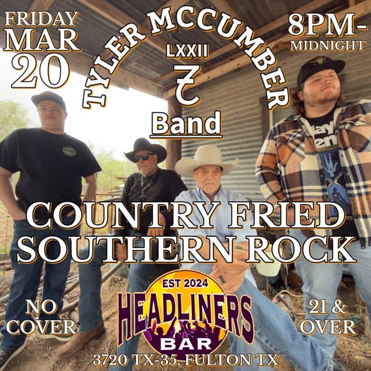The Tyler McCumber Band marks their return to Headliners Bar this Friday at 8pm! This rowdy bunch is bringing the party! See you there!