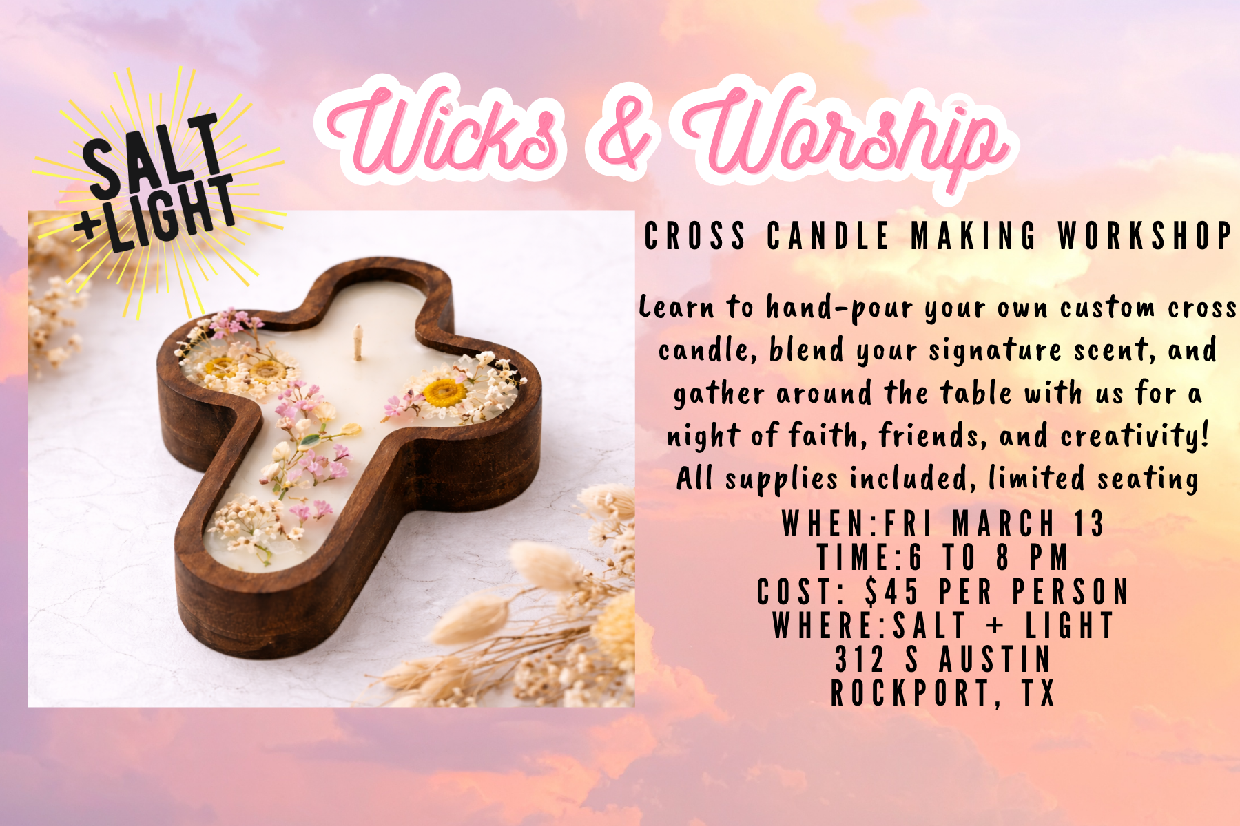 WHEN: Friday March 13 TIME: 6-8 PM We’re lighting up the studio for a night of creativity, connection, and candles. Join us at Salt + Light as we hand-pour custom cross candles from start to finish. You’ll blend your own signature scent, pour your wax, set your wick, and design a candle that’s completely personal […]