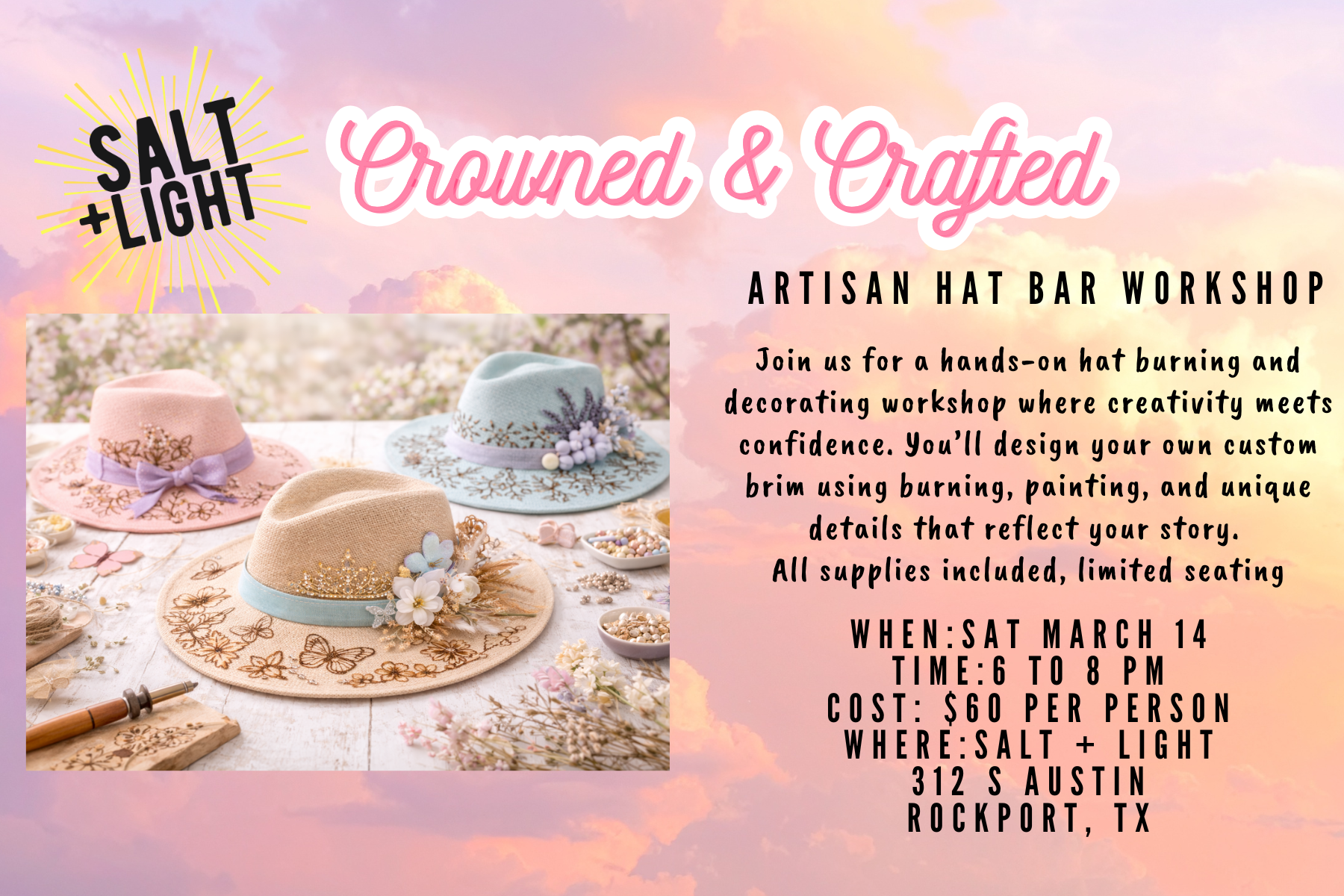 A Hat Burning & Design Workshop at Salt + Light Sat March 14 6-8 pm $60 per person Step into your creativity and design a hat that tells your story. Join us for Crowned & Crafted, a hands-on workshop where you’ll burn, paint, embellish, and customize your own felt hat from start to finish. We’ll […]